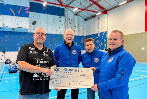 Overraskelse i Risørhallen: Kiwanis ga 70 000 kroner til barna SJEKK: Terje t. Christensen, Edgars Podins og Tom Erik Store overrakk sjekken fra Kiwanis til Odd Sverre Aasbø og Risør Håndballklubb. Foto: Christian Ellefsru
